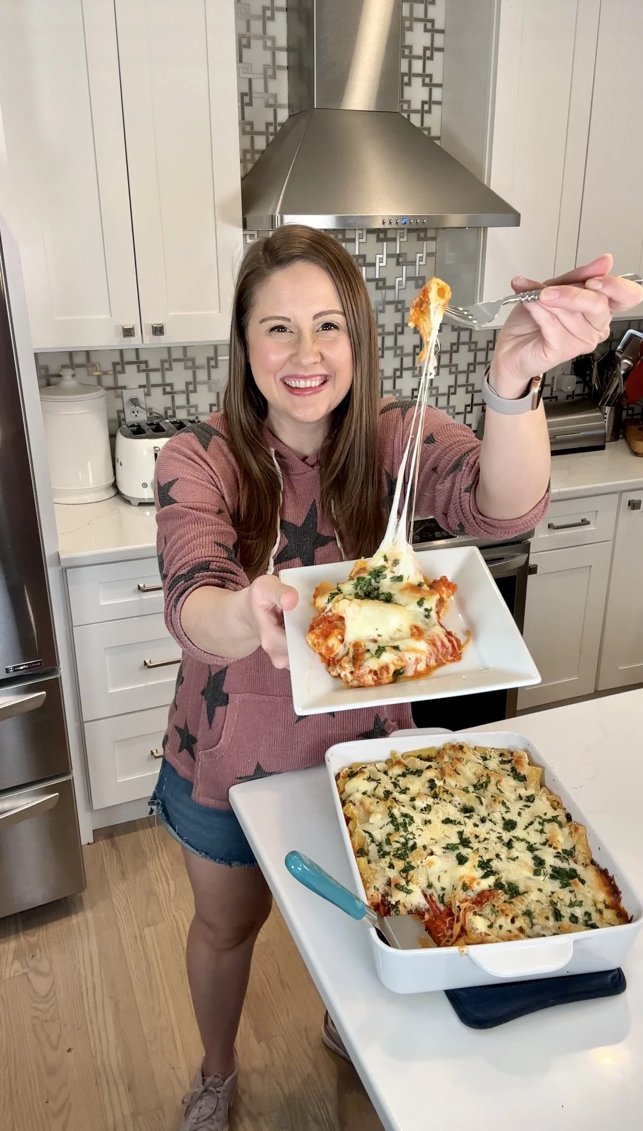 This simple recipe is perfect for a weeknight dinner and would make a great dish to pass at parties too! My Cheesy Million Dollar Pasta Bake is pretty much comfort food at it’s best! This one is always a crowd pleaser and is so easy to throw together. Plus, you get tons of leftovers so you’re off cooking duty for another night. This easily feeds my family of 6 for 2 nights especially when you pair with sides. Steamed veggies are a great option to pair with this and some really yummy bread works great too. That way you can scoop up all of that extra sauce and cheese! Be prepared for some epic cheese pulls too!
