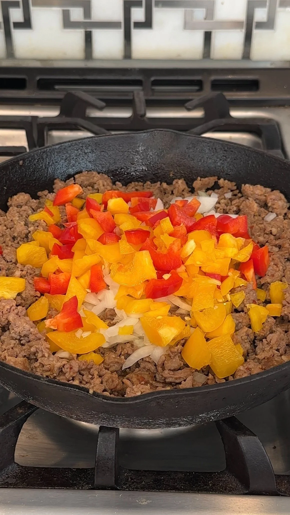 Brown sausage and add veggies cooking on low for 2-3 minutes, drain fat