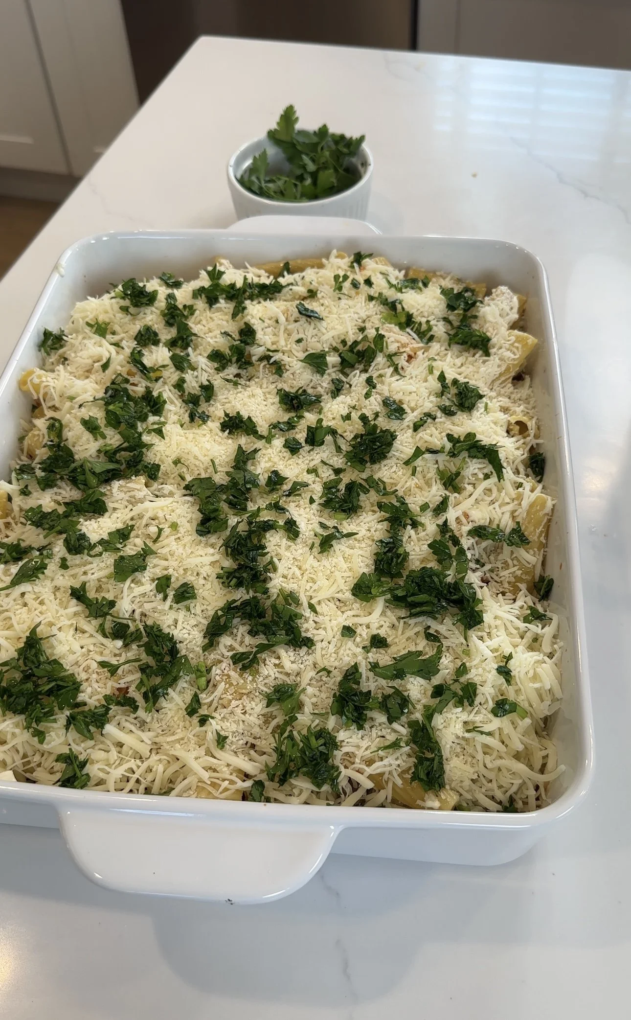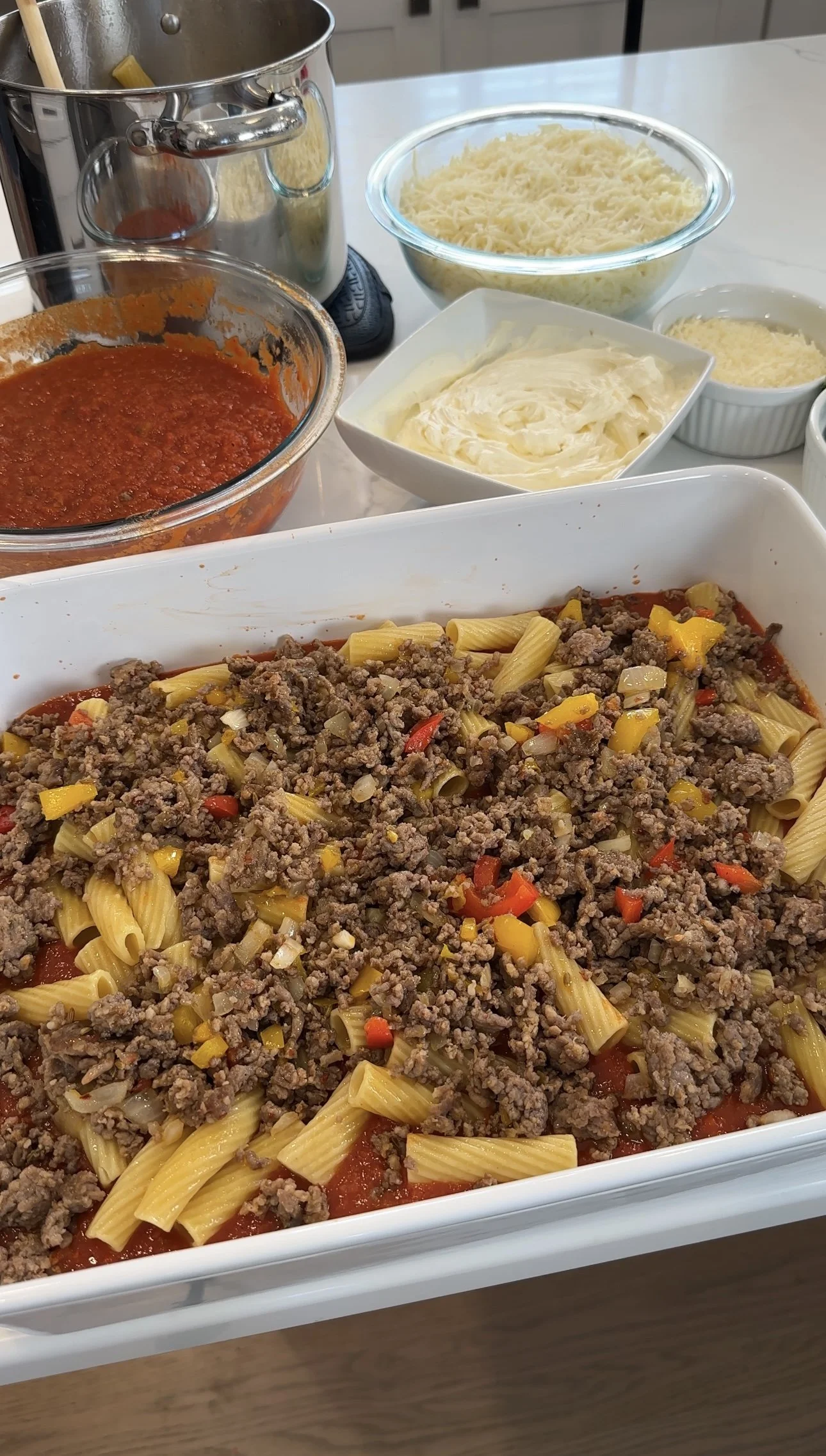 Pro Tip: Boil pasta a bit shorter than al dente cooking instructions. For example I cooked the rigatoni about 4 minutes less than the package instructions stated. Since we are baking this dish with lots of suace, the noodles will cook in the oven too and you don’t want them to end up soggy!