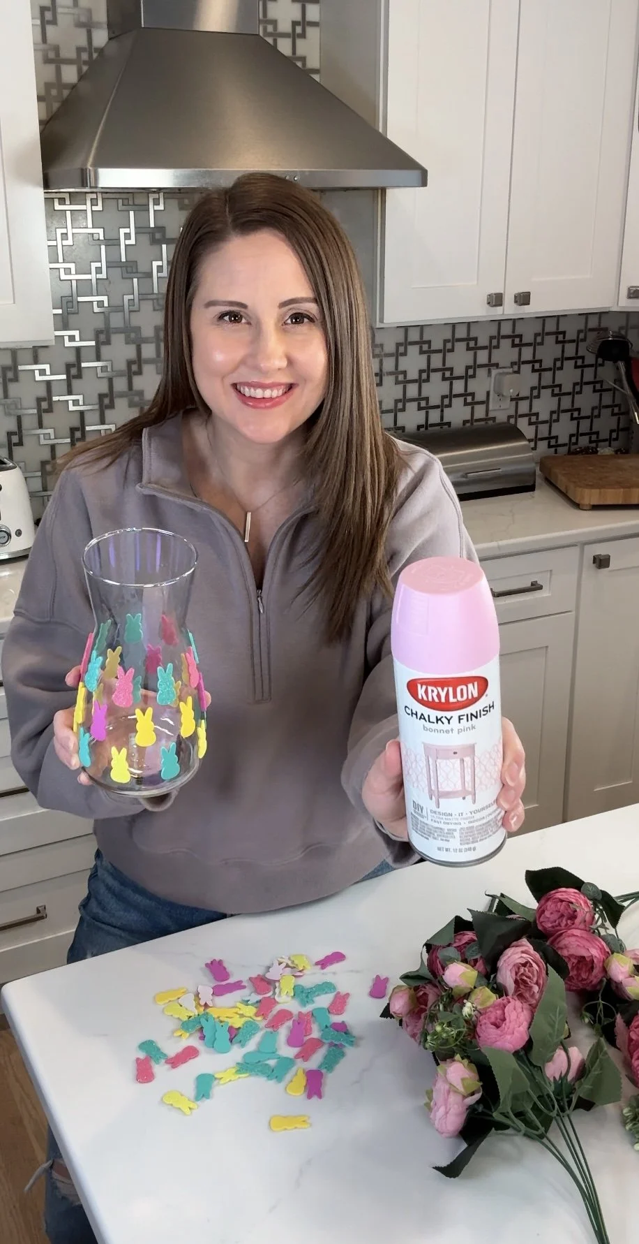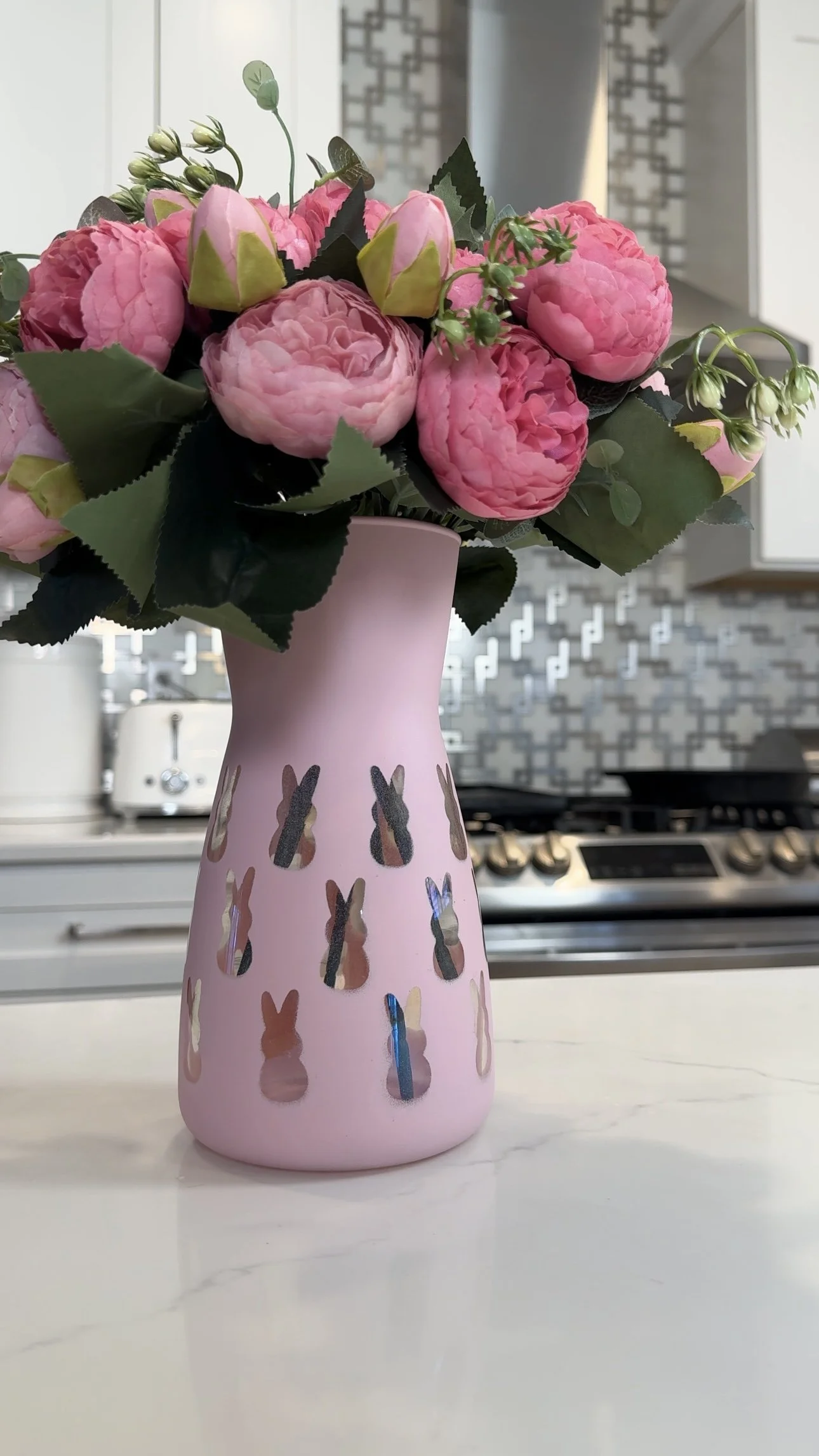 Once all the stickers are removed and any remaining residue is cleaned off, step back and admire your handiwork! If desired, you can apply a clear sealant spray to the vase to protect the paint and add a glossy finish. Allow the sealant to dry completely before using or displaying your bunny vase. Now it’s time to add flowers. I chose to go with pretty faux peonies but these can easily be interchanged for fresh flowers.