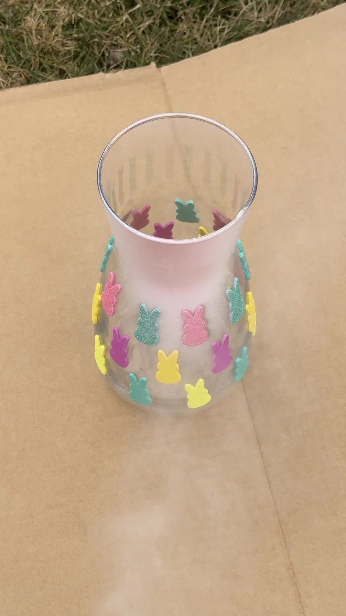 Once the base coat is dry, it's time to get creative with your foam stickers! Peel off the backing of the bunny-shaped stickers and carefully place them onto the painted surface of your vase. You can arrange them however you like, creating a pattern or scattering them randomly for a whimsical look. I ended up spacing them evenly per row and then staggering them between rows.