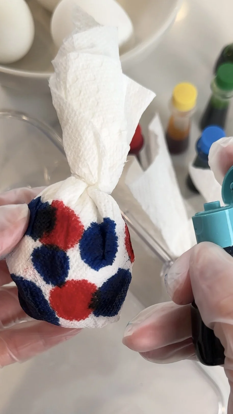 Set up a workspace over a plastic food container to catch any drips. Choose your desired food coloring colors and add drops directly onto the paper towels wrapped around the eggs. Experiment with different color combinations and placement for unique designs. I used both traditional and neon colors.