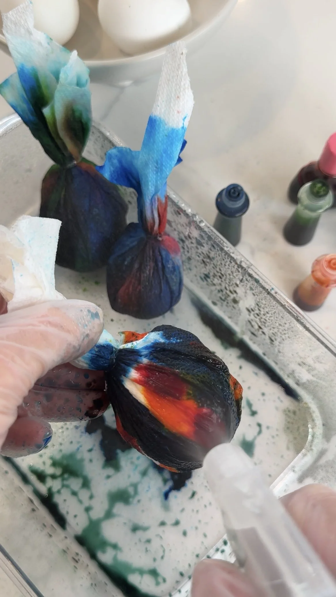 After the soaking time is complete, carefully remove the paper towels from each egg to reveal the vibrant tie-dye designs underneath. Rinse each egg under cold water to remove any excess dye, gently rubbing the shells to ensure thorough rinsing.