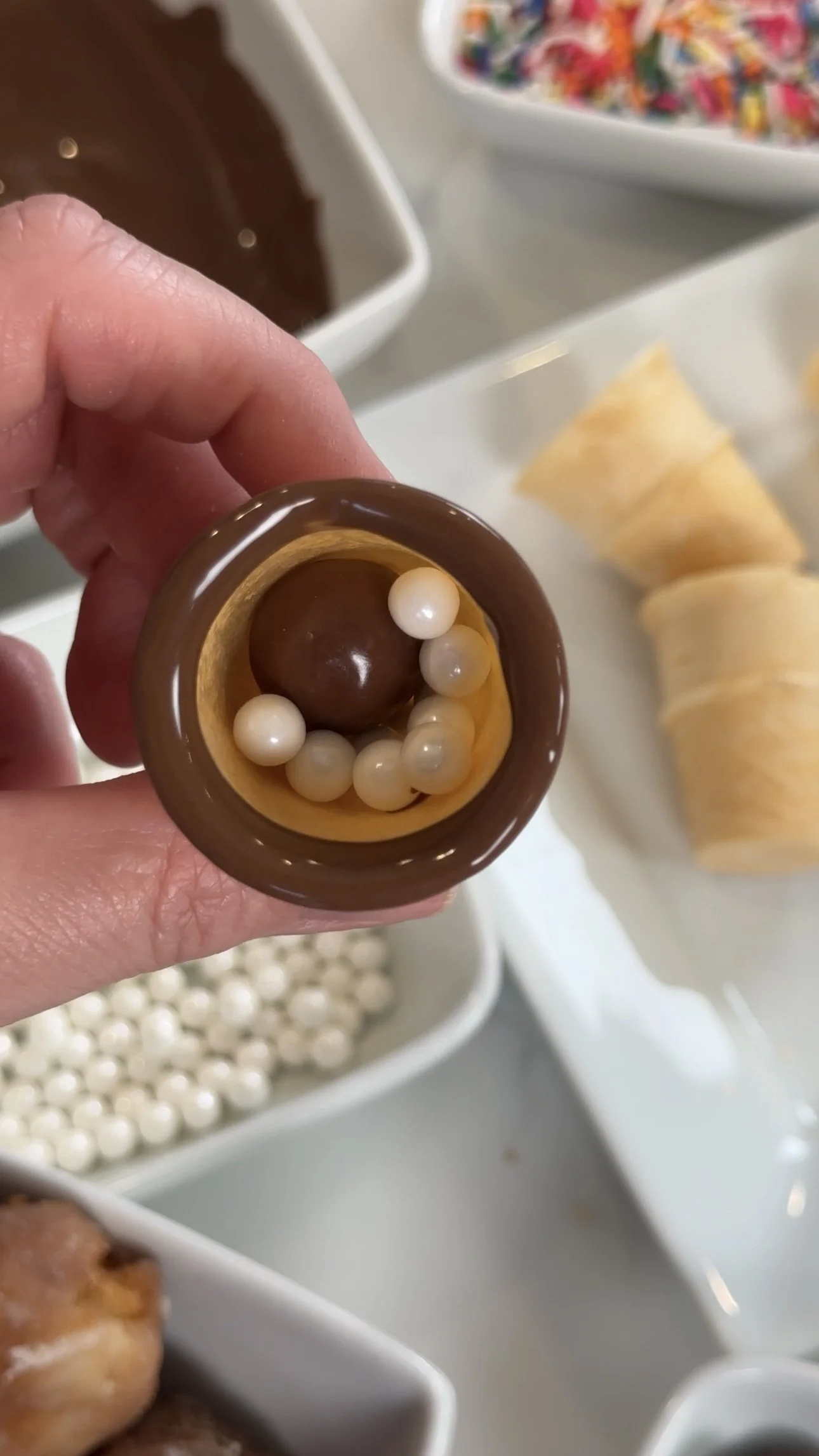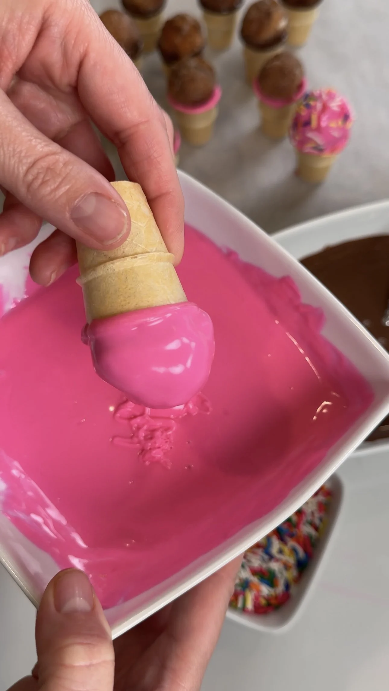 Dip the entire donut hole that is now attached to the cone back into the melted chocolate or candy melts. You’ll want to make sure the donut hole is covered completely. It is ok to overlap slightly on the cone. This ensures that the donut holes are securely attached to the cones. Now these treats are really starting to look like ice cream cones!