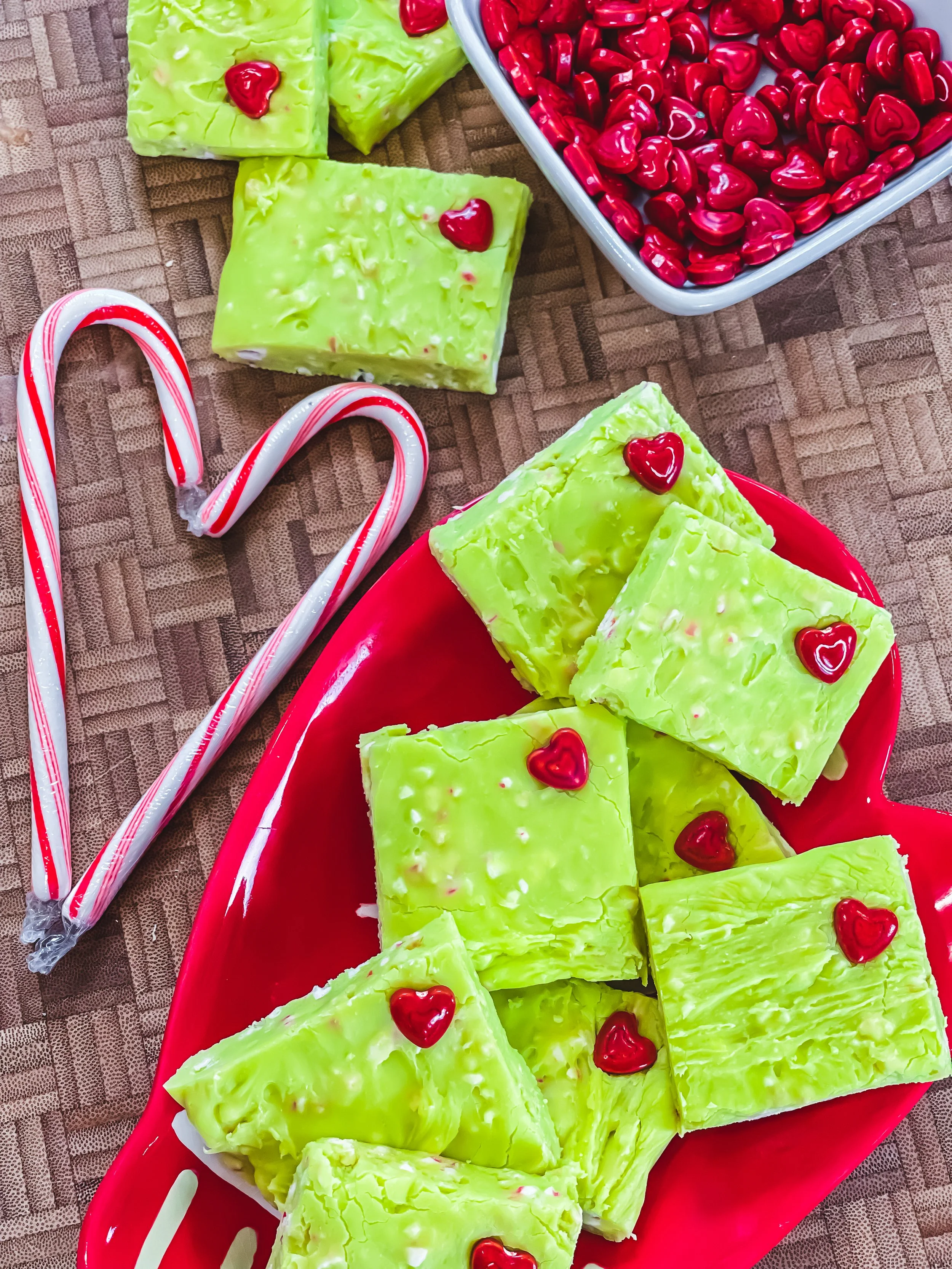 6.) Remove fudge from your baking pan, cut into squares, and decorate with tiny red Grinch hearts.