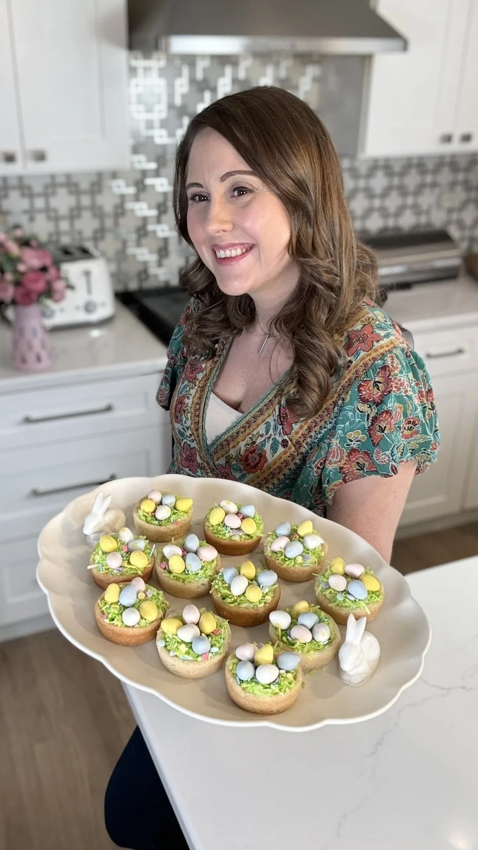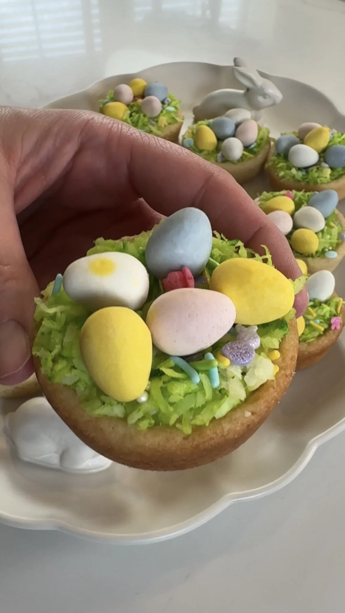 To complete the Bird's Nest Cookie Cups, top each one with Cadbury candy eggs. These colorful candy eggs will resemble bird eggs nestled in the coconut "nests," adding a festive and delicious touch to your Easter treats. You can place them directly on top of the coconut and let them rest there or you can add a small dollop of frosting on top of the coconut to help them adhere to the nest.