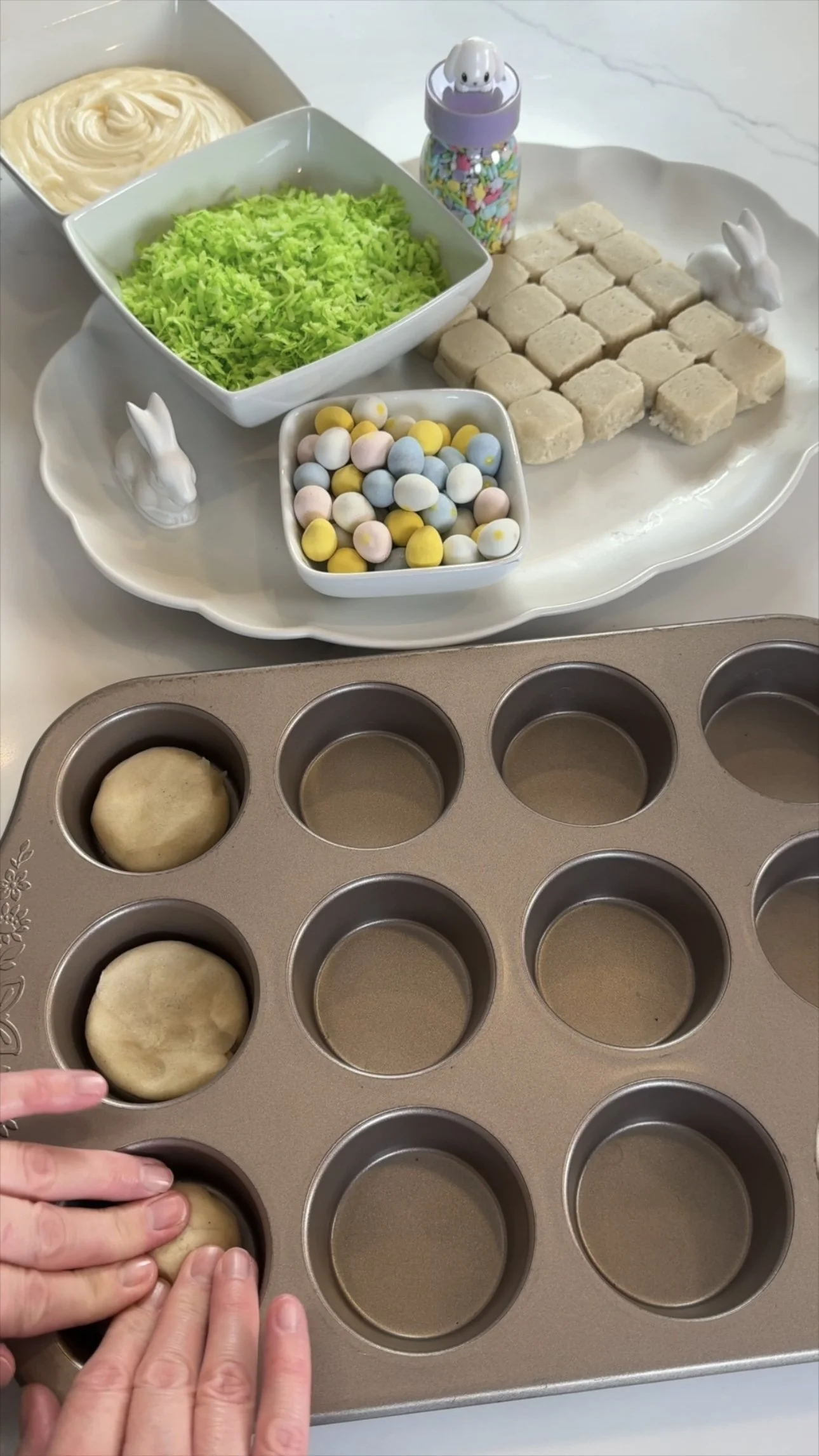 To start, preheat your oven according to the instructions on the premade sugar cookie dough package. The dough is already divided into equal portions for you. I’ve found that 2 pieces of dough work perfectly to fill each muffin cup on a standard size 12 opening muffin tin. Gently press into the bottom of each opening.