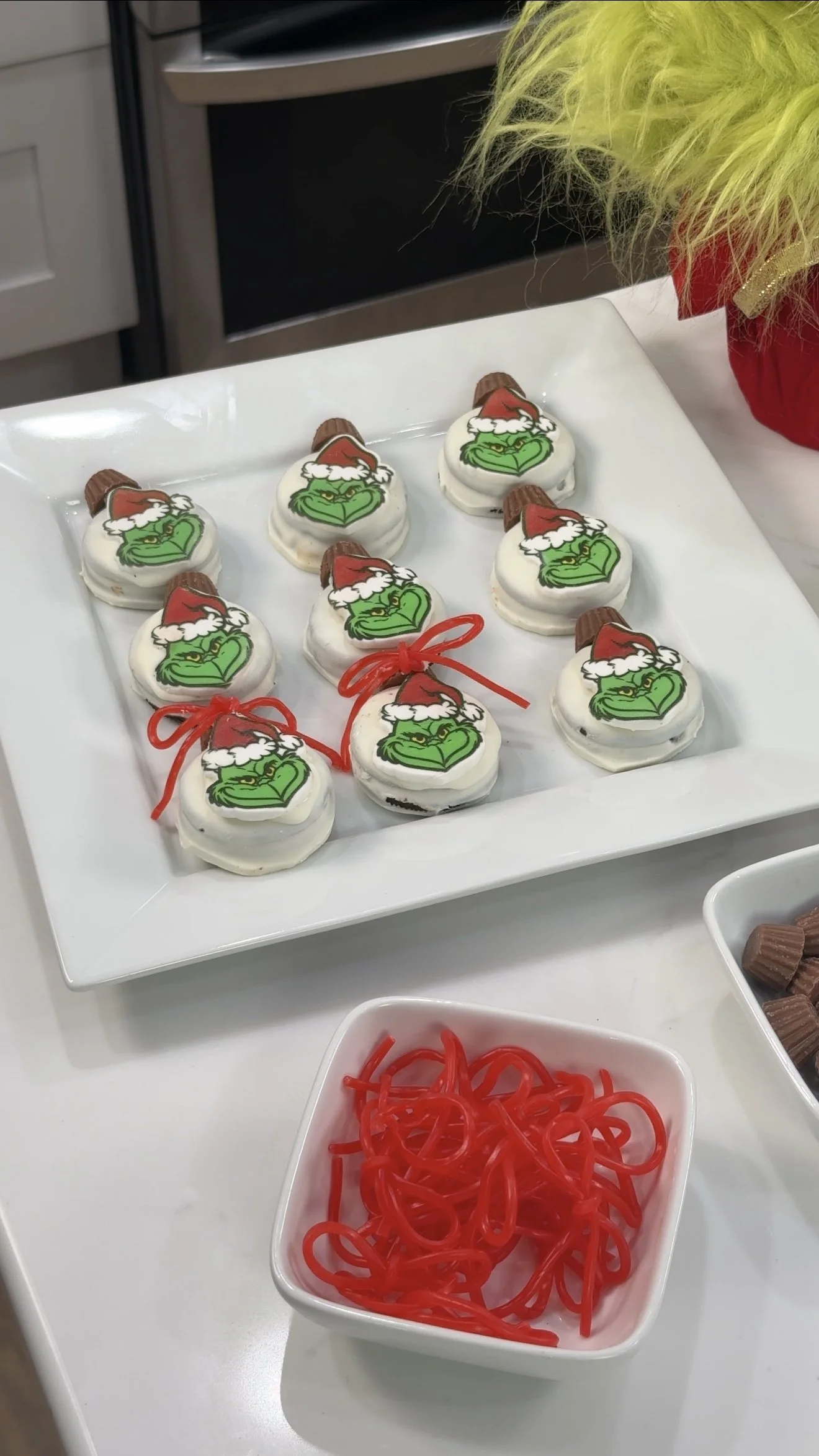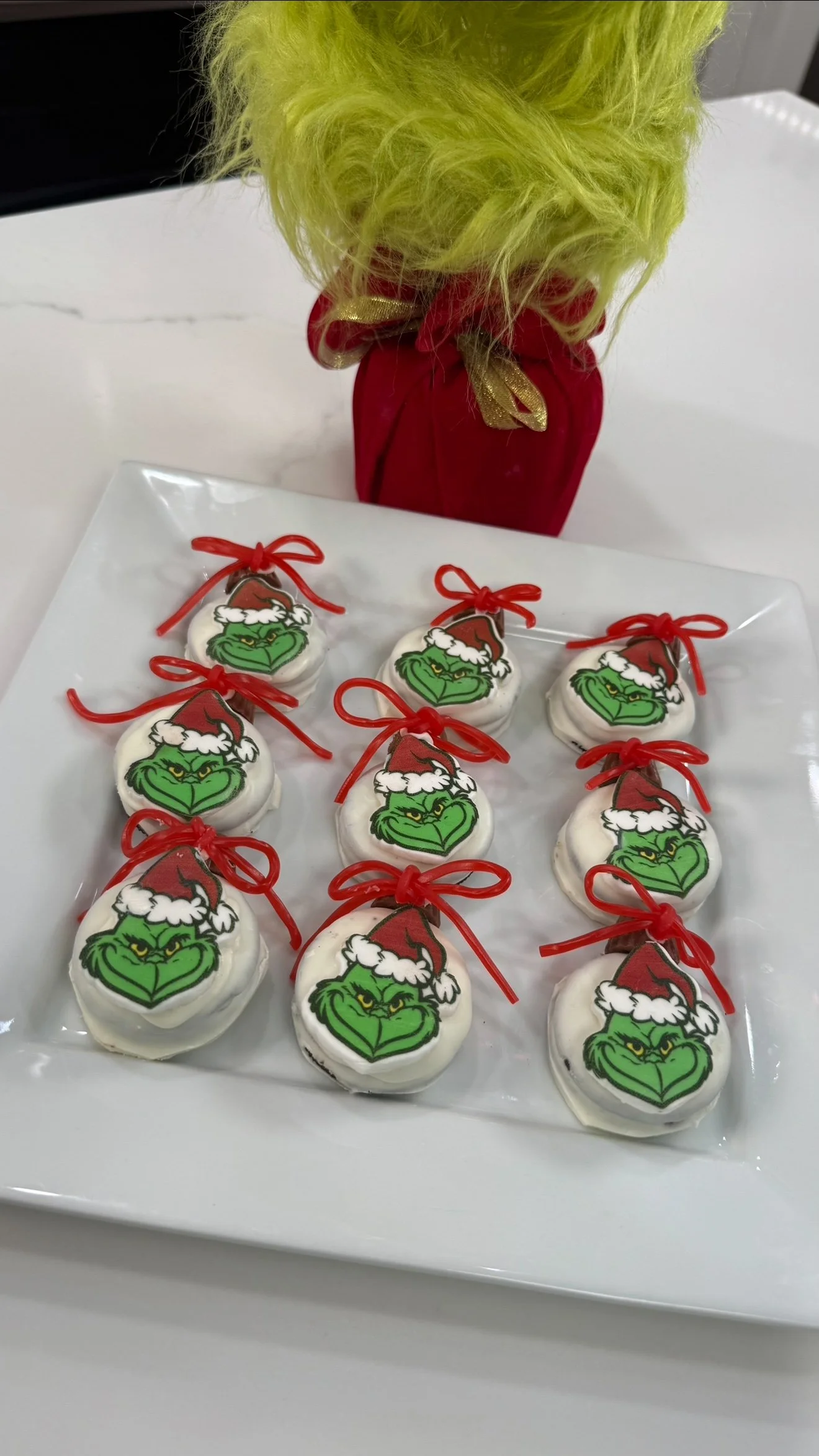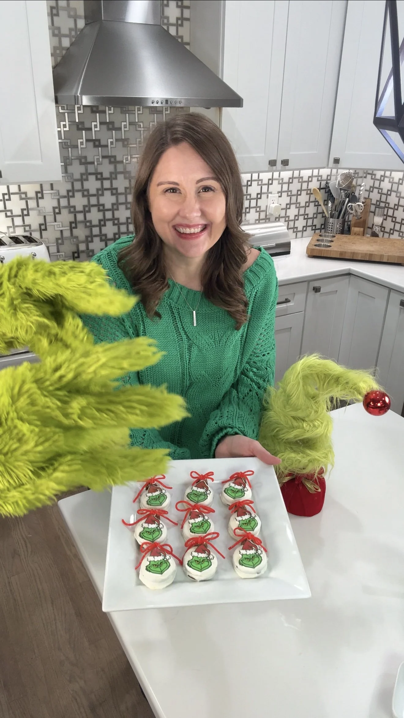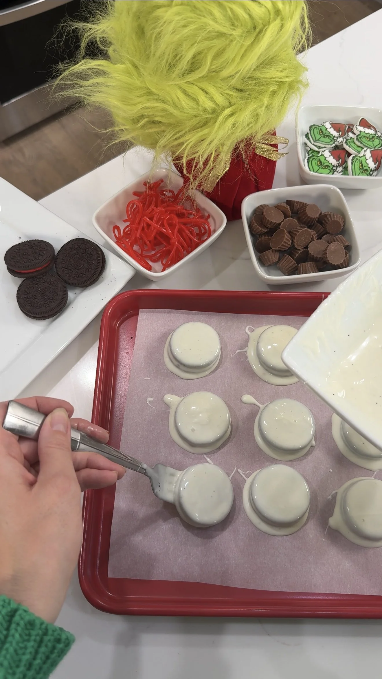 • While the chocolate is still wet, gently place an edible Grinch decoration in the center of each Oreo. Use a toothpick for precision if needed.