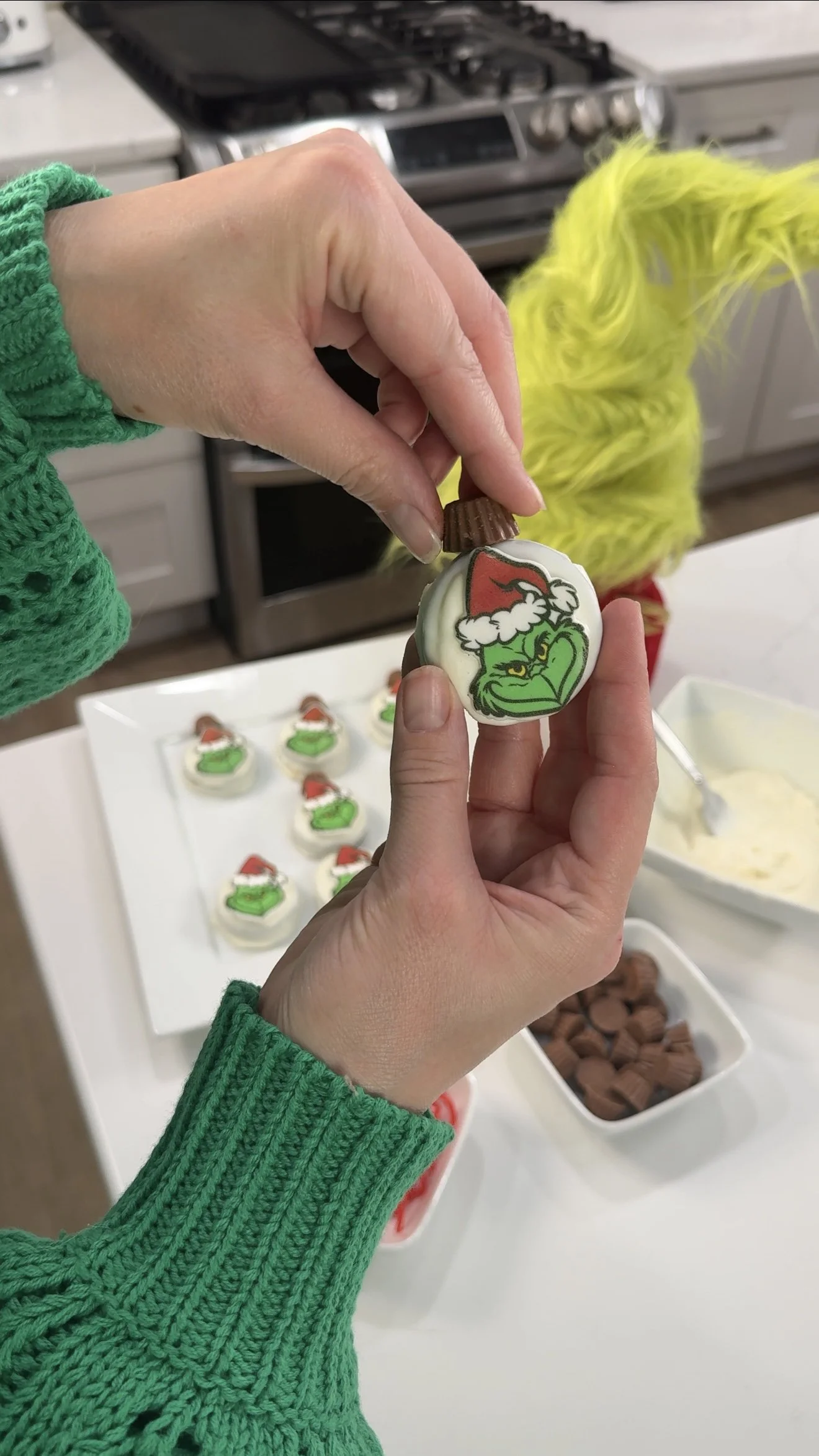 Place a mini Reese’s on the top edge of the Oreo (opposite the Grinch face) to resemble the ornament’s cap.