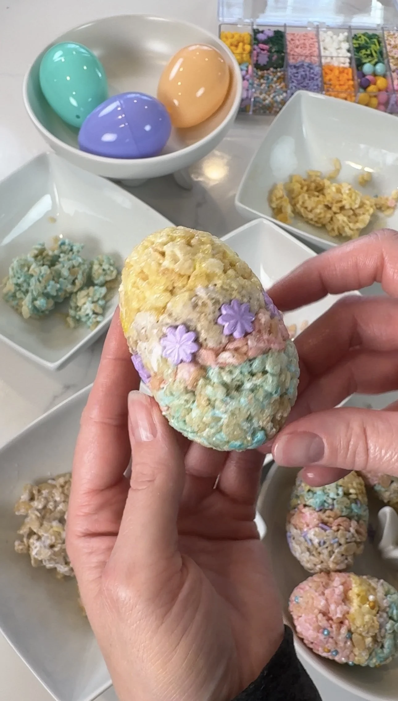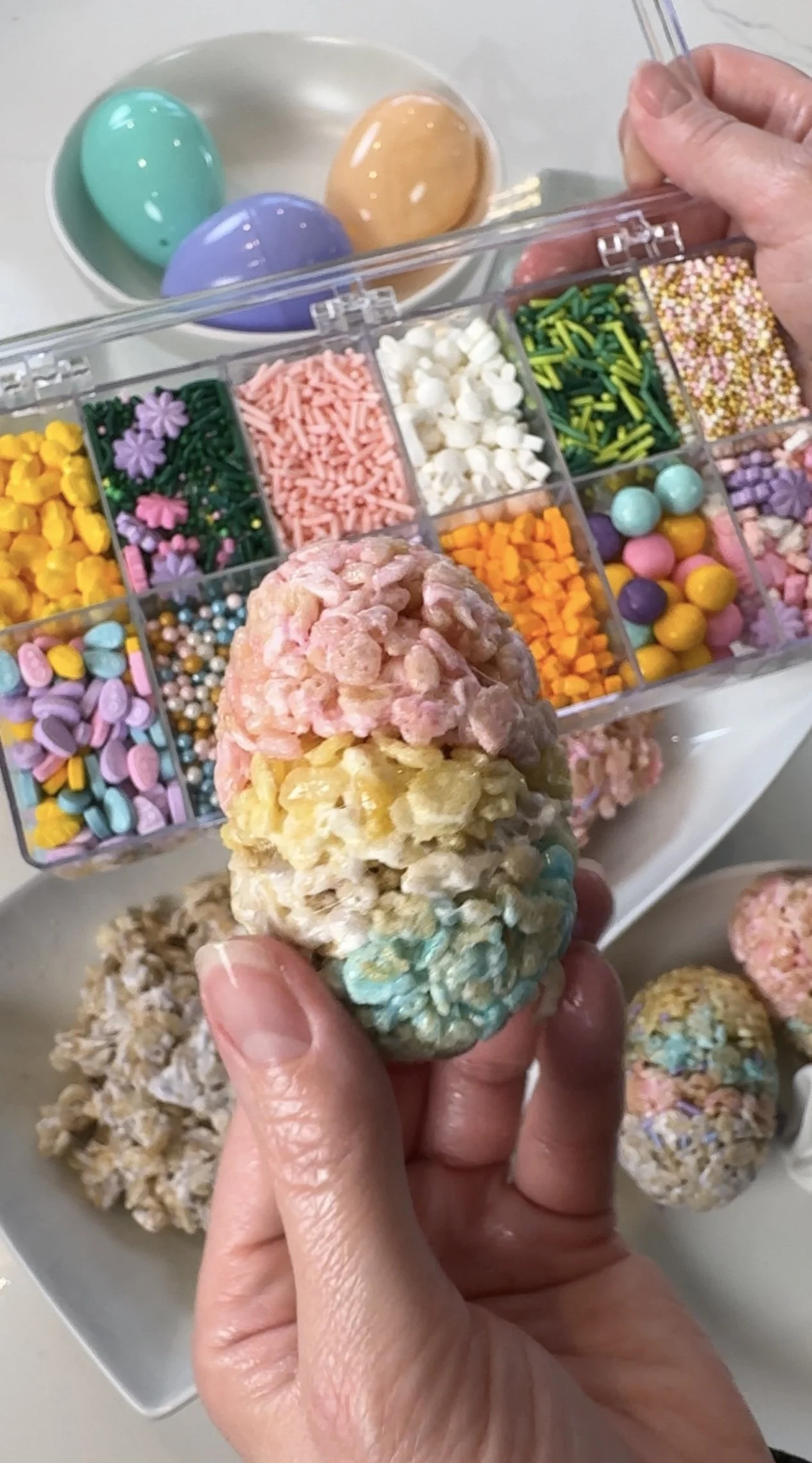 Can you ever really have too many sprinkles? For an extra festive touch, sprinkle various shapes and colors of sprinkles and press into the Layered Peeps Rice Krispies Eggs. This step adds texture and visual appeal to the finished treats, making them even more irresistible. I like to place them back in the plastic eggs at this point to reshape as they may lose their shape a bit as you press the sprinkles in.