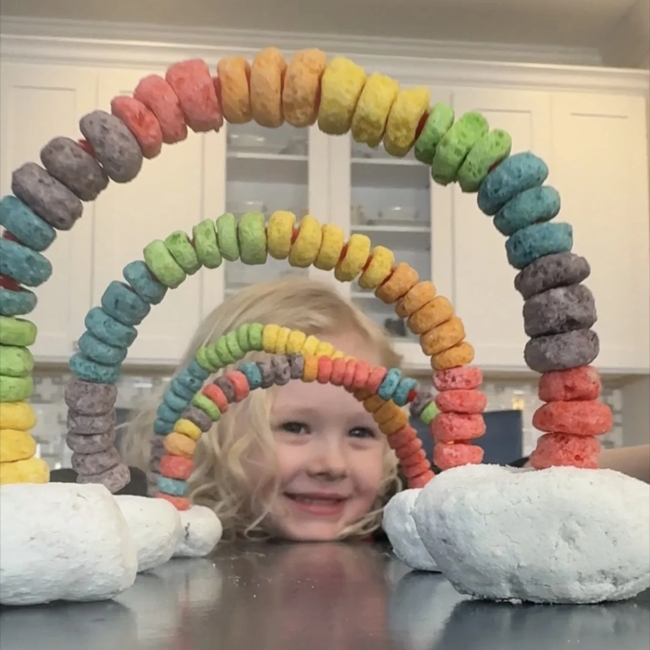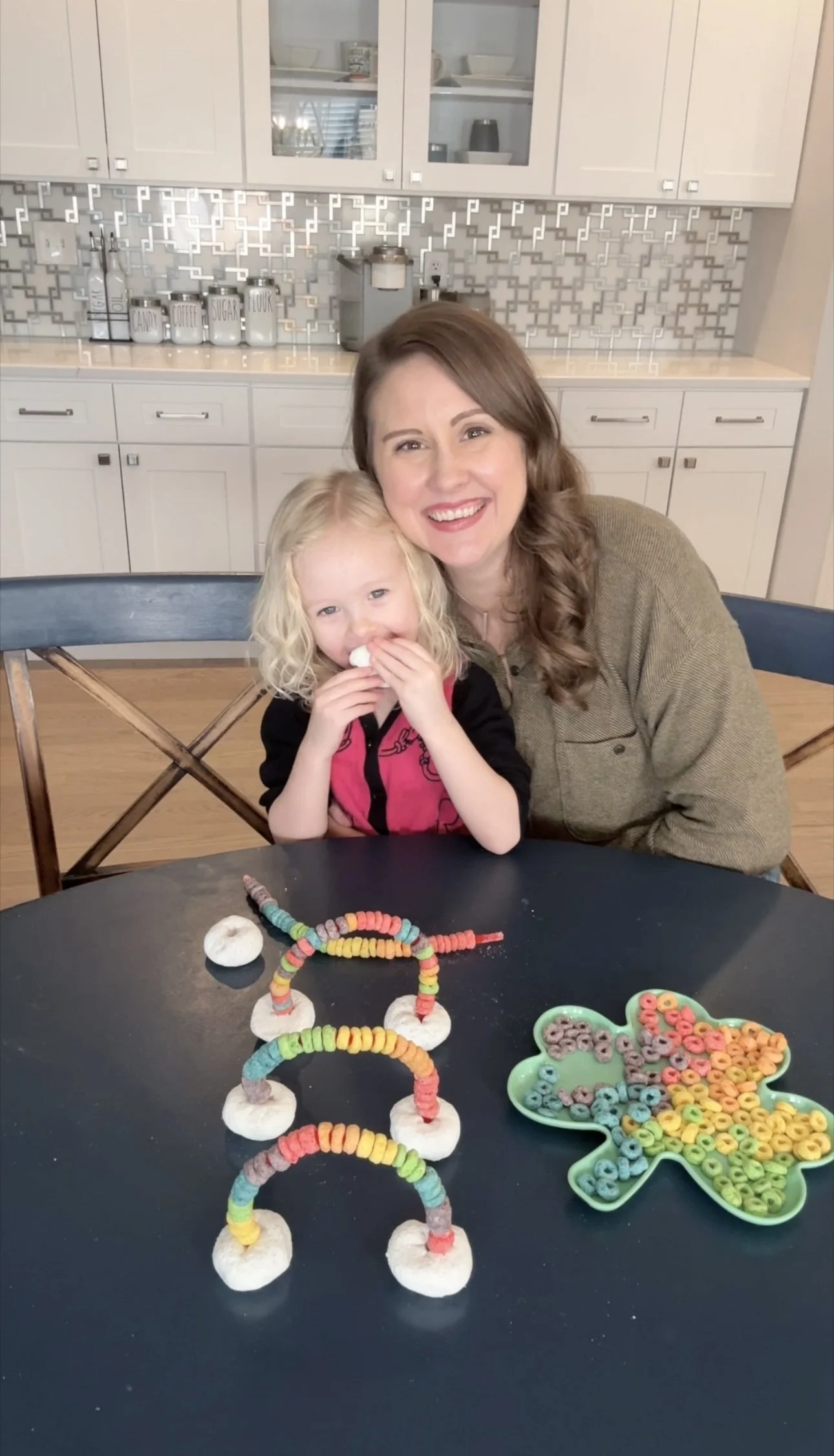 3. Insert each end into a mini powdered sugar donut and voila, you’ve got the cutest Rainbow Leprechaun Bait! You can arrange them out on your table or counter to give a leprechaun a chance to run through a rainbow tunnel! You can see our video instructions here.