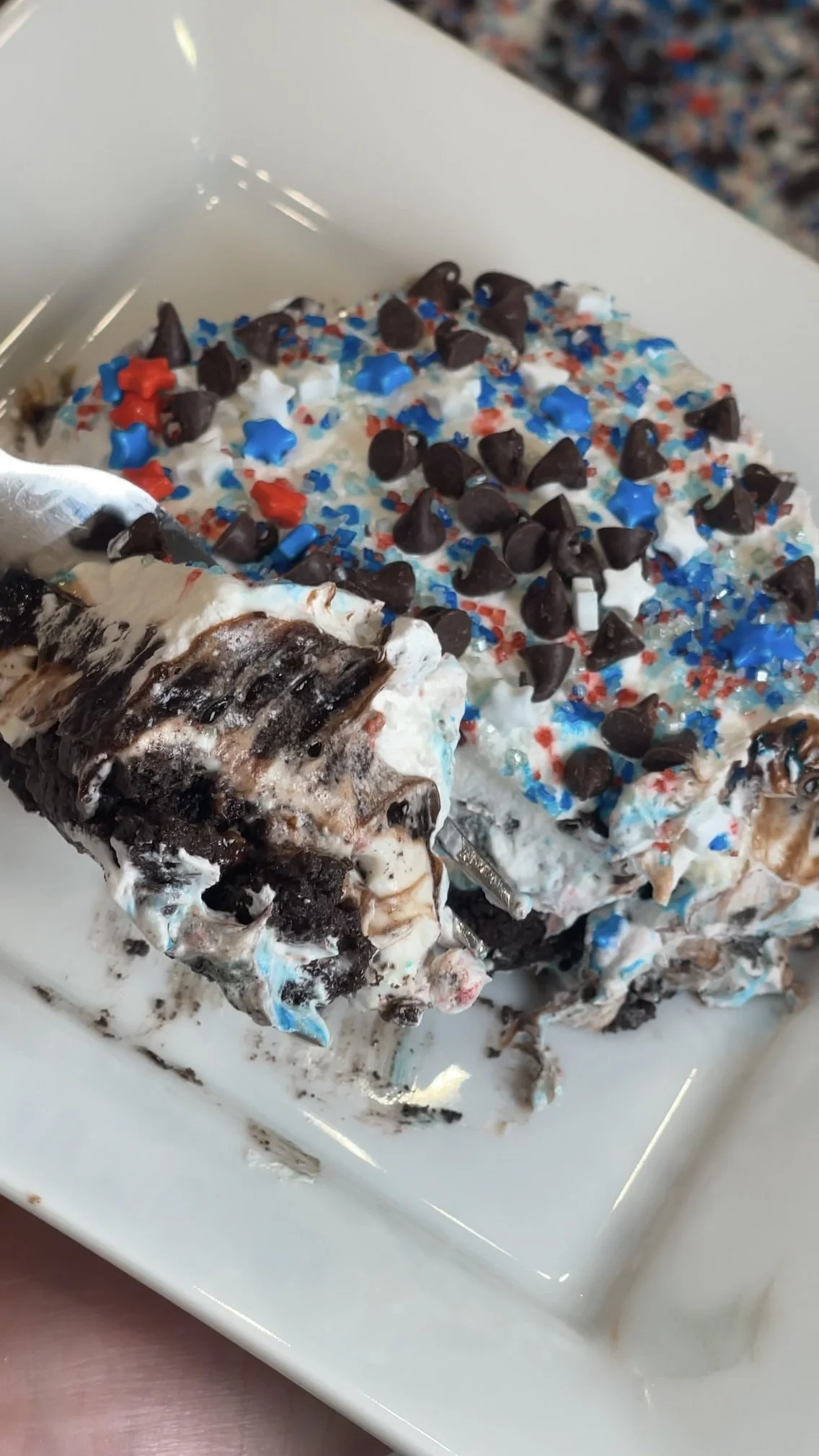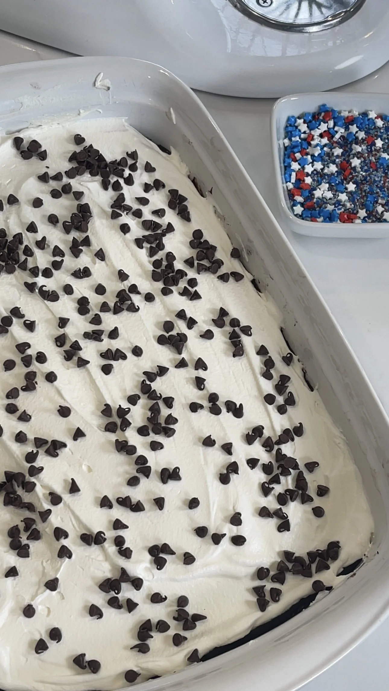 Add Chocolate Chips and Sprinkles: Sprinkle the mini chocolate chips evenly over the Cool Whip layer. Add the red, white, and blue patriotic sprinkles for a festive touch.