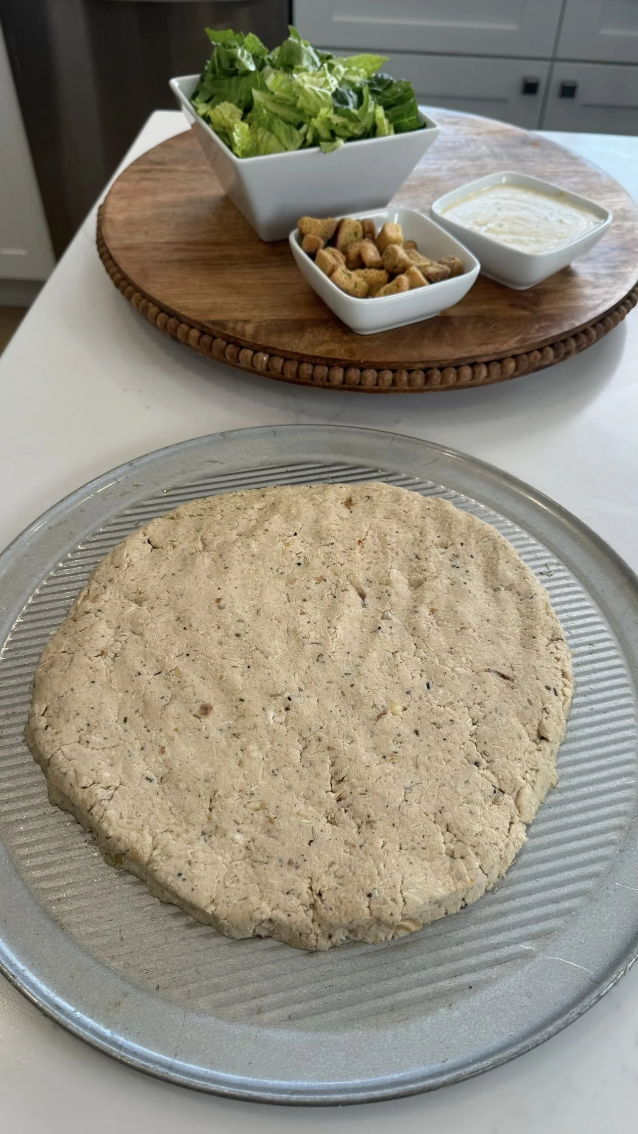 Once the chicken crust has cooled, spread a layer of Caesar salad dressing over the top.