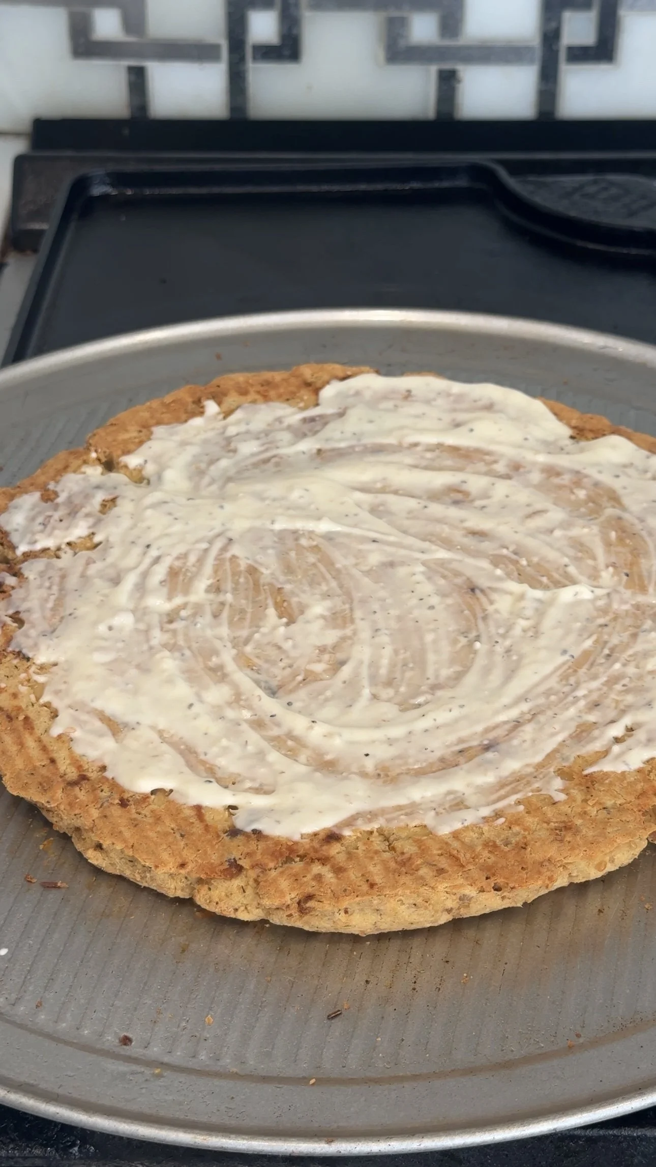 To flip the crust, place another tray flat over the pizza and carefully flip both trays together. Exercise caution to avoid breaking the crust. Once flipped transfer bake to the original pan.