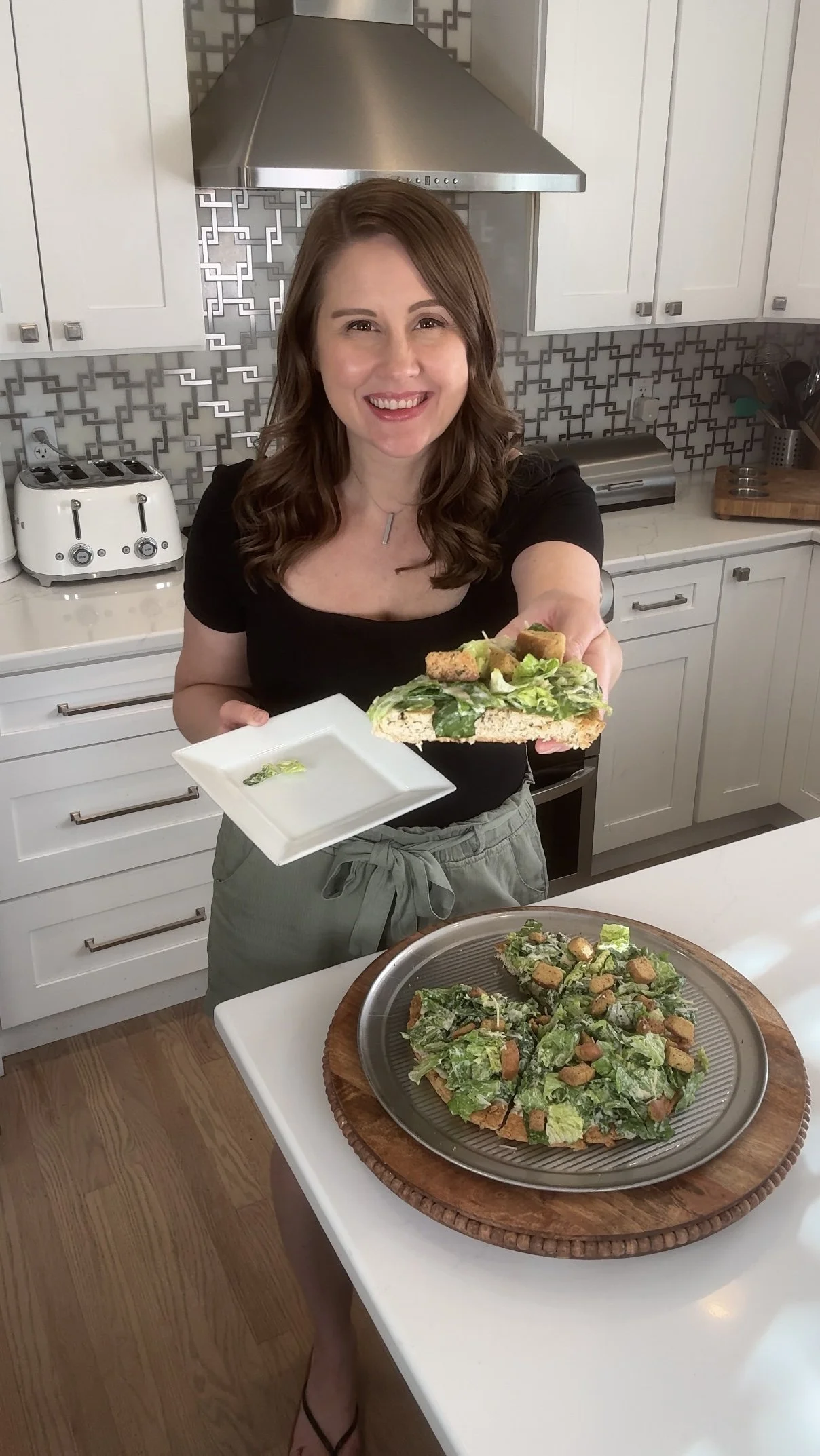 Once assembled, slice the Caesar Salad Pizza into wedges using a sharp knife or pizza cutter.