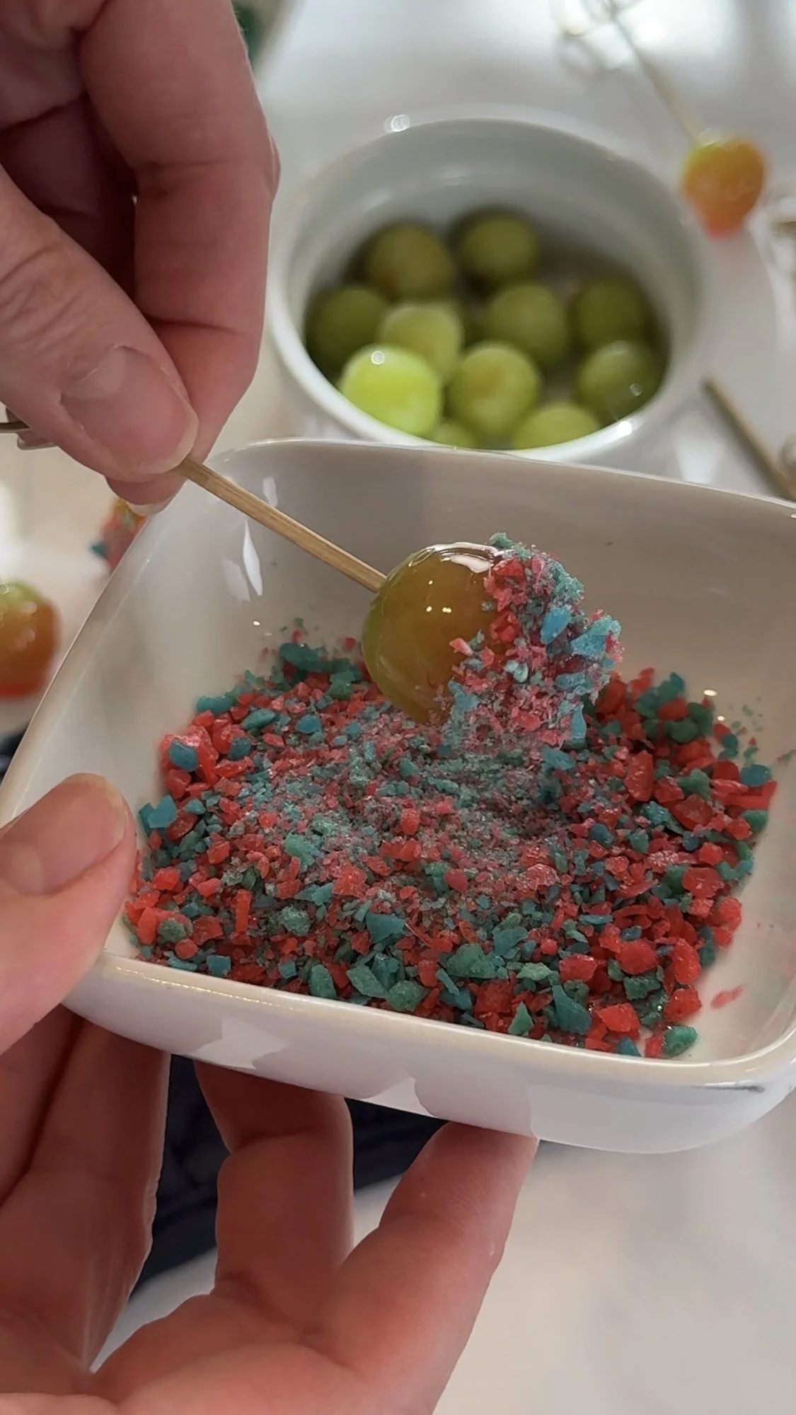 Once your Jolly Rancher candies are melted, it’s time to dip the grapes. Take the frozen grapes out of the freezer and insert a toothpick or candy pick into each grape. Quickly dip each grape into the melted candy, making sure it gets an even, thin coating. A thin layer is ideal to ensure the perfect crunch.